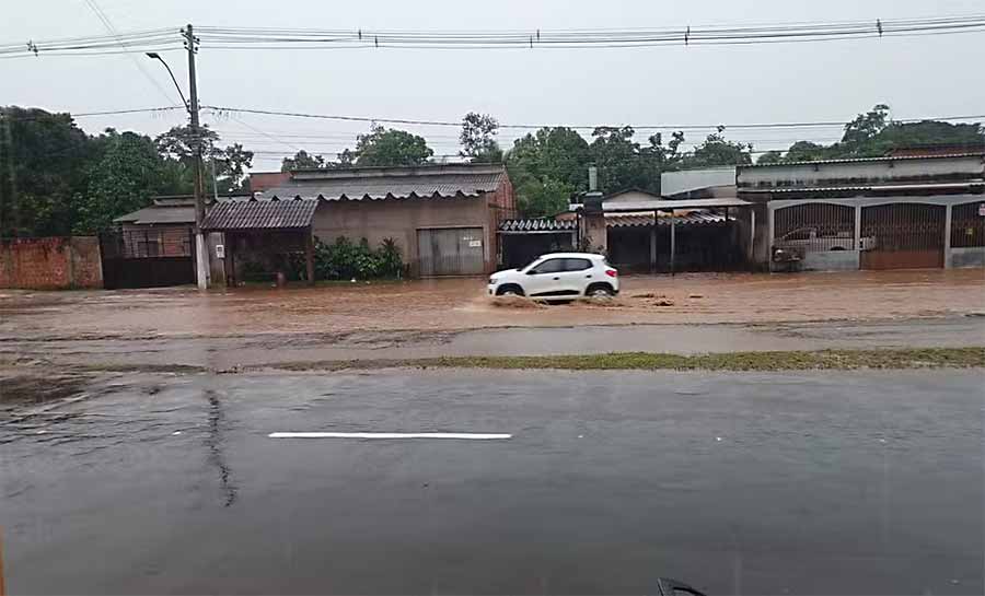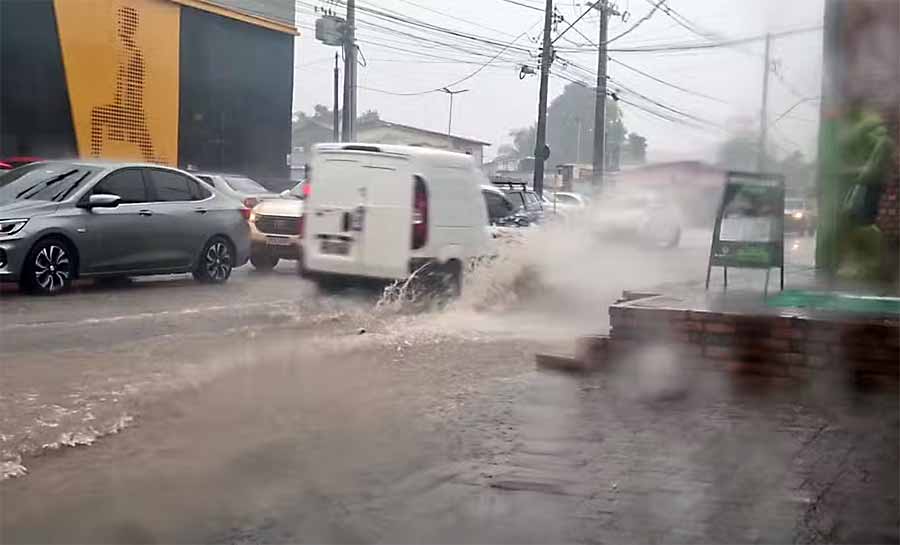 A chuva que caiu no início da tarde deste sábado (10), em Rio Branco, causou pontos de alagamento em diversos bairros da capital, inclusive no Centro da cidade.