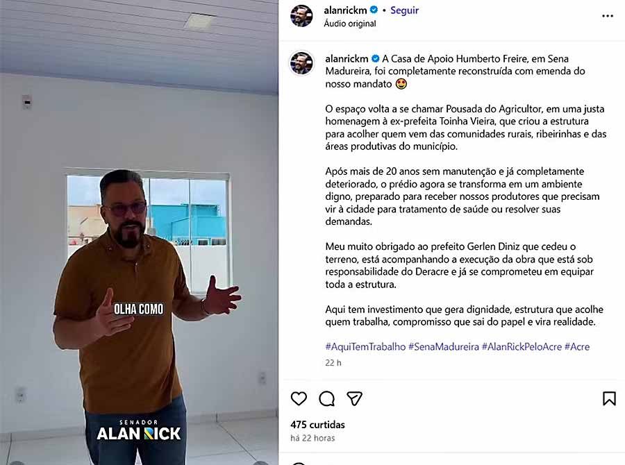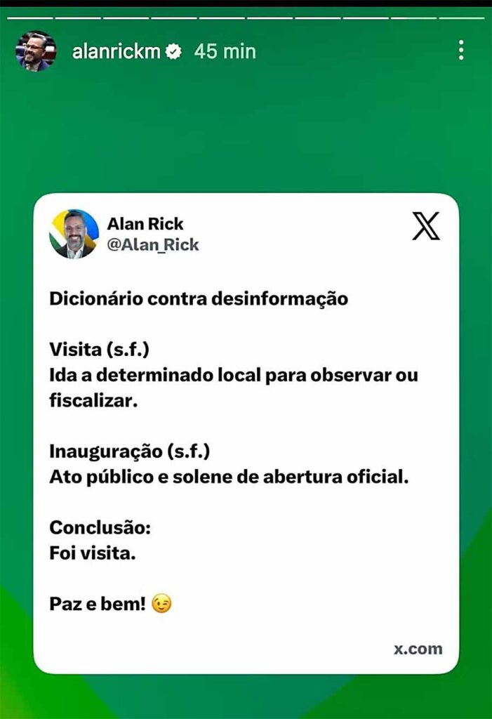 Um vídeo publicado por Diniz em uma rede social ainda na quarta mostrou ele e Alan Rick passando pelos cômodos do espaço, com obras e instalações já adiantadas. Na publicação, o gestor destacou que a construção, tocada pelo órgão estadual, contou com emendas do parlamentar e que o terreno e prédio são do município. Rick publicou um vídeo semelhante em sua página, com imagens do que classificou como uma ‘vistoria’ nas obras.