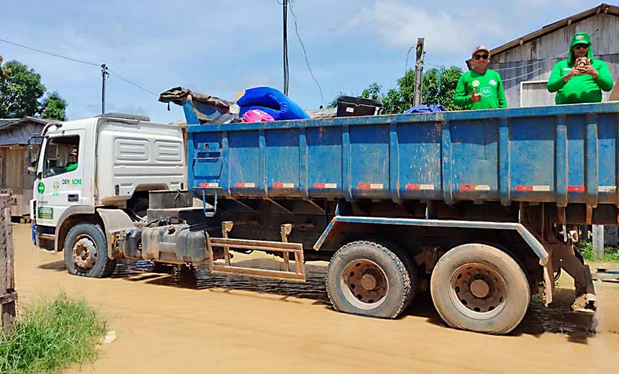 As equipes do Deracre estão auxiliando na retirada de móveis, eletrodomésticos e pertences das casas atingidas, garantindo que os itens sejam levados para locais seguros, como residências de familiares e áreas fora da zona de inundação, reduzindo os prejuízos das famílias afetadas.