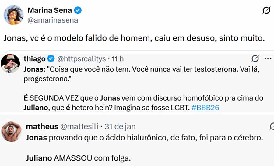 “É a segunda vez que o Jonas vem com um discurso homofóbico para cima do Juliano, que é hétero, hein? Imagina se fosse um LGBT”, reclamou um. “Jonas provando que o ácido hialurônico, de fato, foi para o cérebro. Juliano amassou com folga”, debochou o segundo.