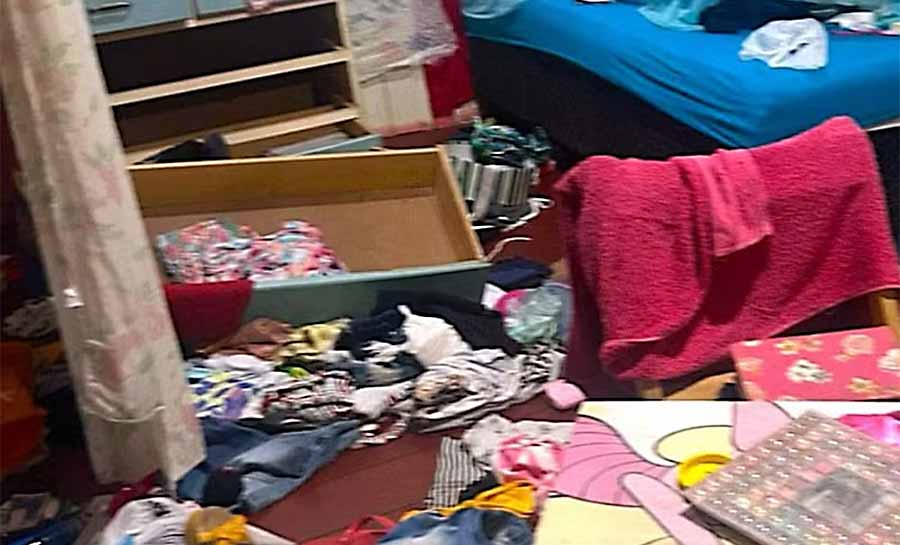 Peritos também detectaram que ela tinha um ferimento compatível com arma branca no lado esquerdo do pescoço, além de pequenas lesões nas mãos. Uma foto registrada no local mostra que a casa estava revirada.