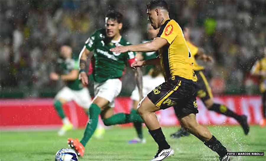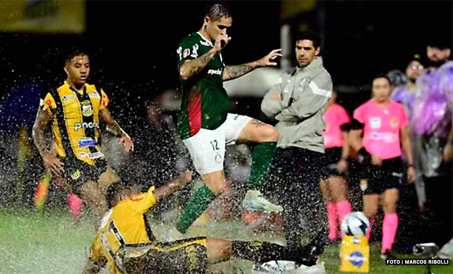 O campo encharcado pela chuva, com diversas poças, prejudicou o nível técnico da partida, mas não faltou entrega e emoção na etapa inicial em Novo Horizonte. Logo aos 5 minutos o Palmeiras abriu o placar, em lance de bola parada. Andreas Pereira cobrou falta na área, Gustavo Gómez cabeceou em cima da marcação, e a bola sobrou para Marlon Freitas, que soltou uma bomba na trave. No rebote, Murilo finalizou de coxa e mandou para as redes. A equipe do interior também usou do “chuveirinho” para buscar o empate. Aos 24, Vinicius Paiva cruzou na área e a defesa alviverde se enrolou. Carlos Miguel saiu para fazer a defesa e deixou a bola passar por baixo de seu corpo. Ligado, Matheus Bianqui se aproveitou do vacilo do goleiro e deu um toquinho, mandando a bola para o gol. Precisando da vitória, os donos da casa seguiram em cima, finalizaram mais (7 a 4), mas não conseguiram o segundo gol.