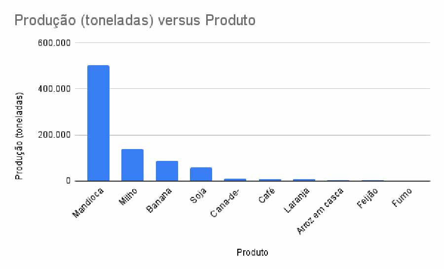 A área plantada no período analisado também apresentou crescimento, passando de 62.804 hectares para 66.325 hectares. As maiores produções continuam sendo de mandioca e milho, com 501.922 toneladas e 137.689 toneladas, respectivamente.