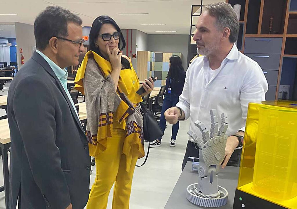 Eles foram recebidos pelo diretor regional do SENAI, João César Dotto, e pela gerente do SENAI Hub, Marcela Fidelis, que apresentaram o trabalho desenvolvido pela unidade no estado, com destaque para soluções sob medida em educação, tecnologia e inovação voltadas a empresas, indústrias e startups.