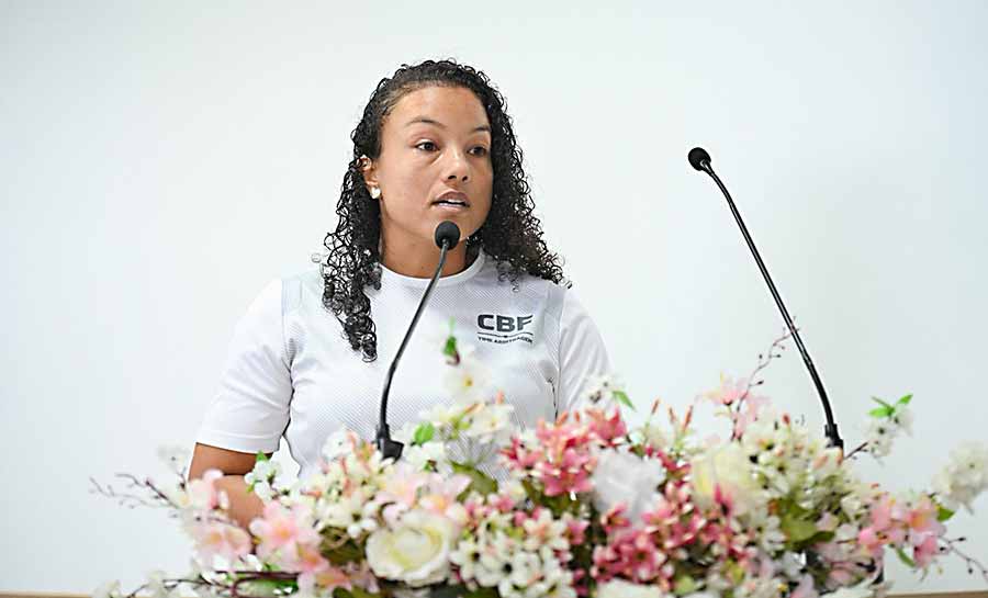 A árbitra assistente de futebol Verônica Severino também compartilhou sua trajetória durante a sessão. Filha de produtores rurais, e mãe desde a adolescência, ela relatou os desafios enfrentados para concluir os estudos e construir carreira na arbitragem esportiva.